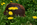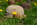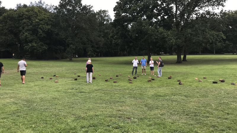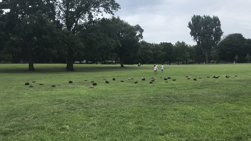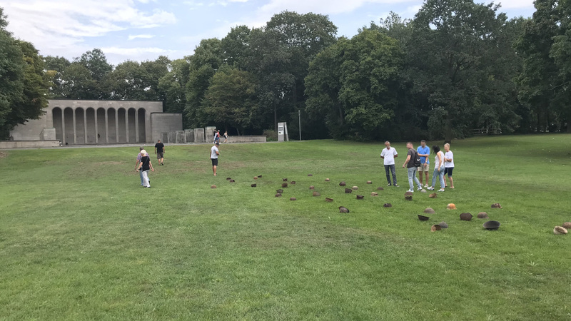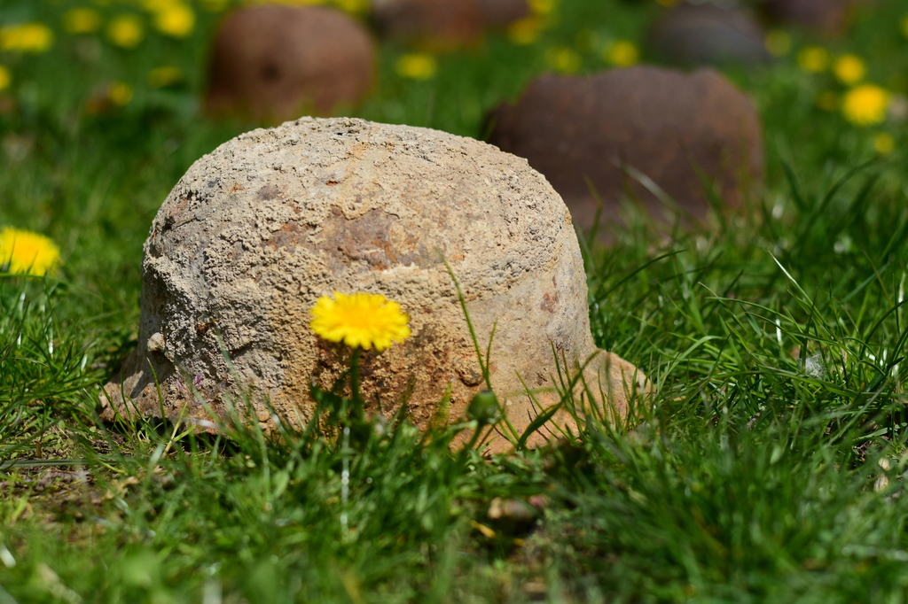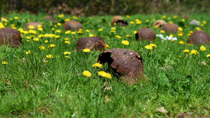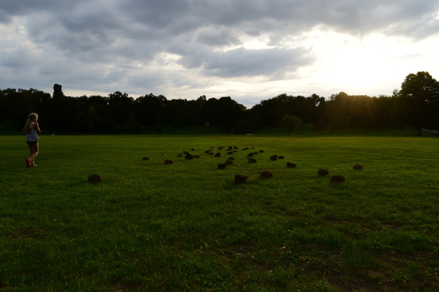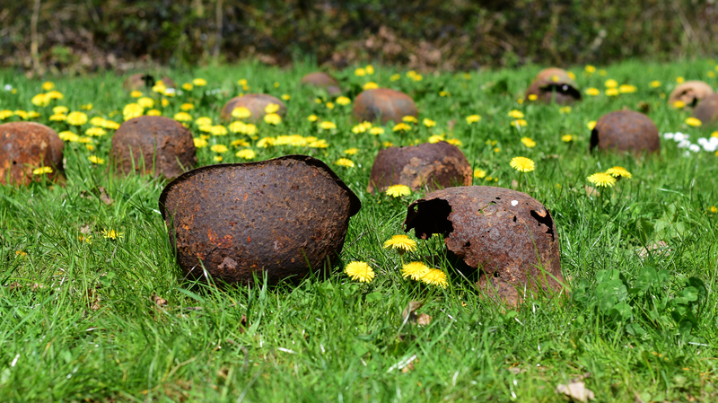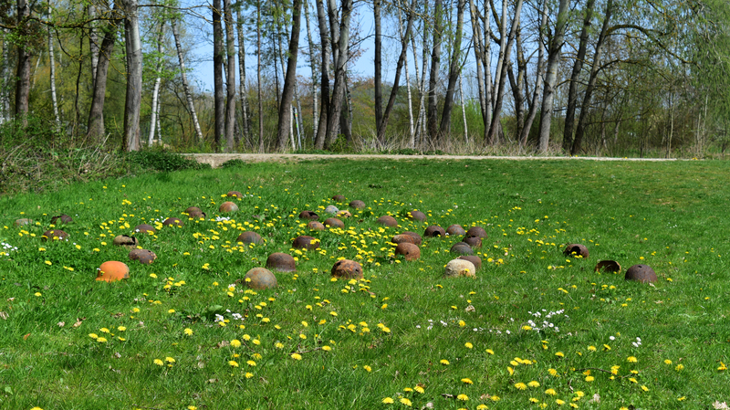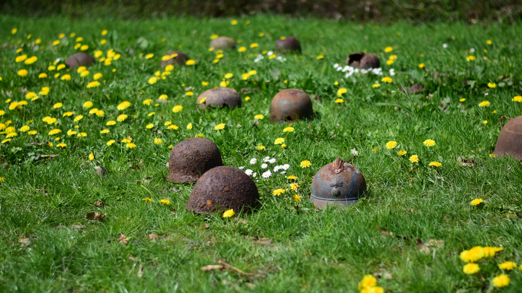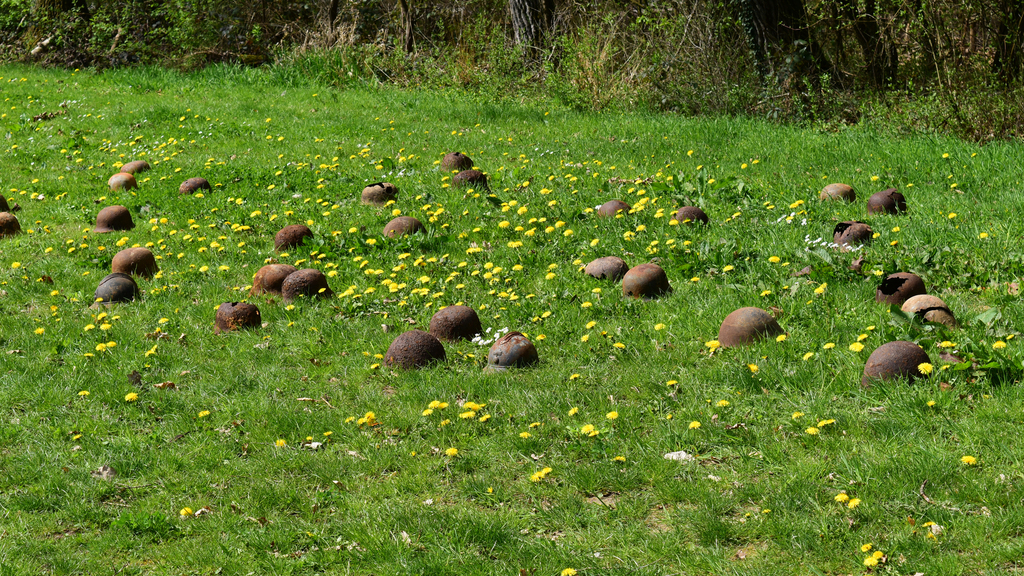 44 verrostete Stahlhelme liegen auf einer Wiese. Von Ferne kann man sie für Maulwurfshügel auf einer Blumenwiese halten – ein zunächst friedliches Bild. Aber wenn man
