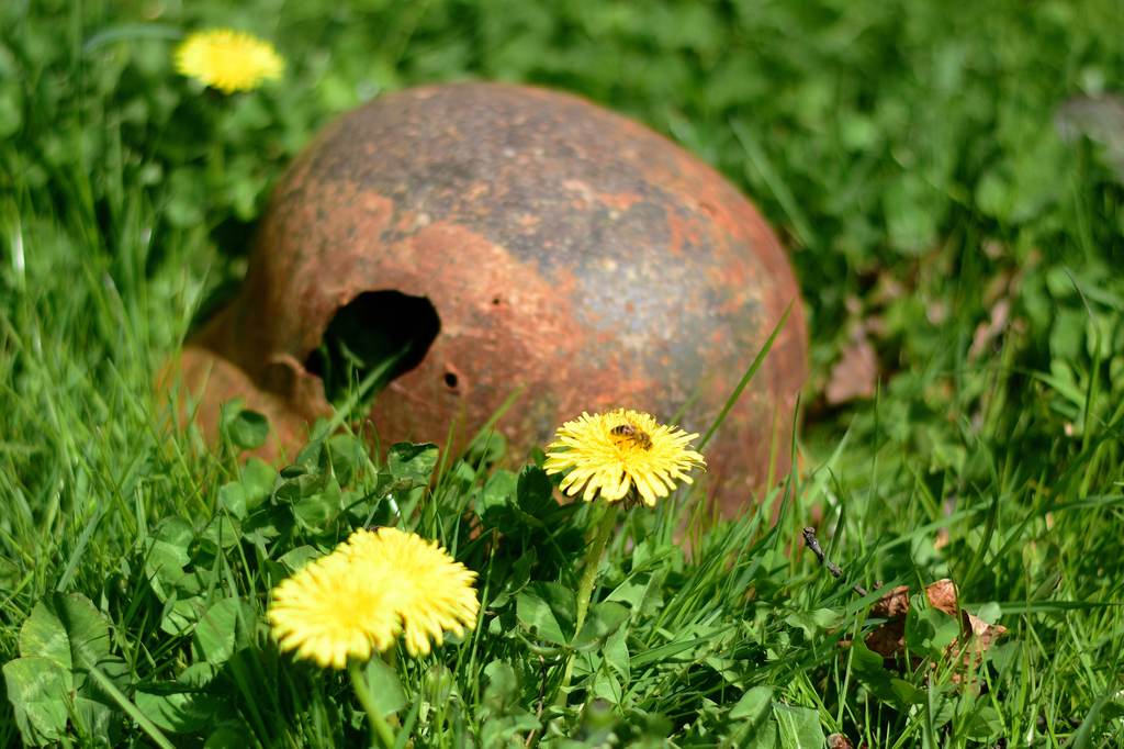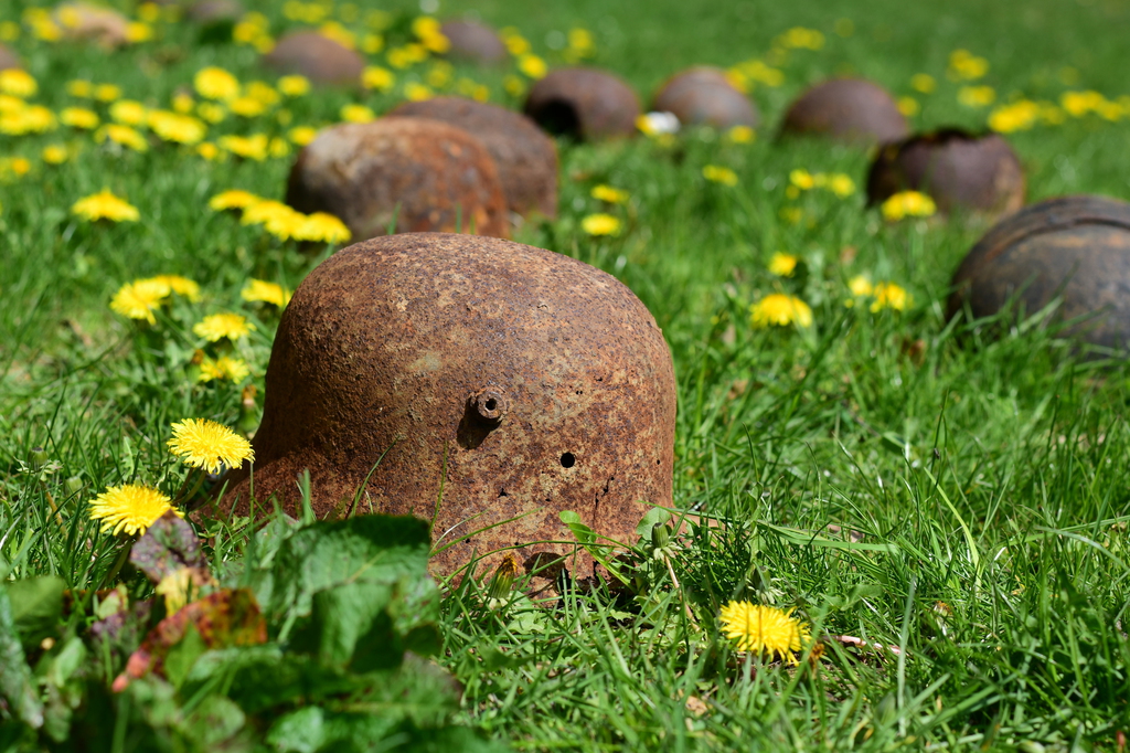 erkennt worum es sich handelt und sich die ersten Assoziationen einstellen, gefriert einem das Blut in den Adern. Diese stark symbolbehafteten verrosteten Stahlhelme bilden einen krassen Kontrast zu